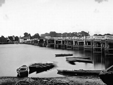This is a wash drawing of Putney Old Bridge, drawn in 1793 by J. Farington. It was a timber bridge constructed by the master carpenter Thomas Phillips to the design of the architect Sir Jacob Ackworth. Built between 1726 and 1729, it existed up until 1886, when it was demolished and replaced by a new stone bridge.
