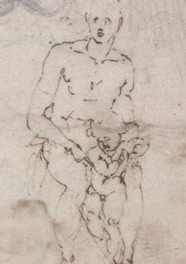 There are also in the verso two pen and ink studies of a child, seen from front and back. They are in a very dark brown ink, and they perhaps relate relate to the sketch of the Virgin and Child on the recto of the sheet. They differ in that while the Virgin and Child sketch is an outline drawing, the two children on the verso are based more on internal modelling defined by bold hatching, making them a more concentrated attempt to define the form.